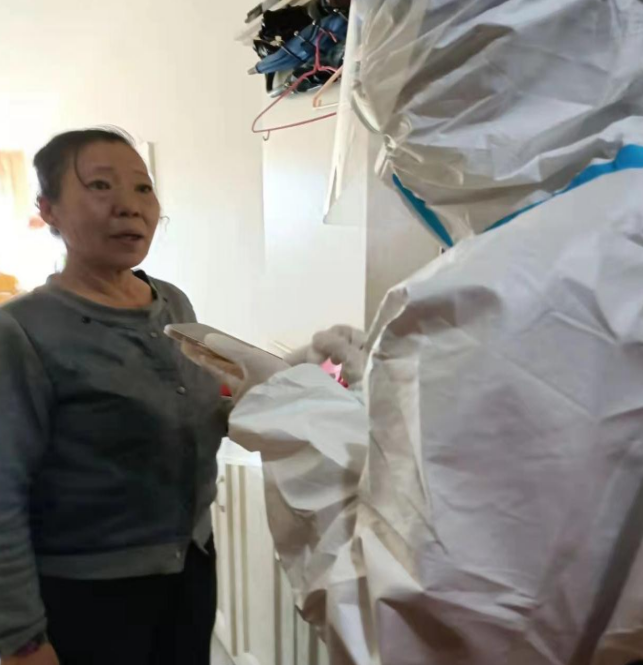根据社区防疫小组的安排,曲舒琳负责对辽源市第六次全民核酸检测工作中无法到采集点的居民进行上门检测。在检测的前一天,她做好个人防护,来到社区对分管区域的居民进行统计,整理了所有需要上门检测的人员名单,对第二天的工作做了充分的准备。第二天一大早,三人为一组,开始上门采集,她主要负责信息登记工作。上门采集的对象多数是行动不便的老人,大多没有吉祥码,需要扫描身份证并手动输入个人信息。在这一天里,她爬了将近20栋楼,采集了90多户居民。
