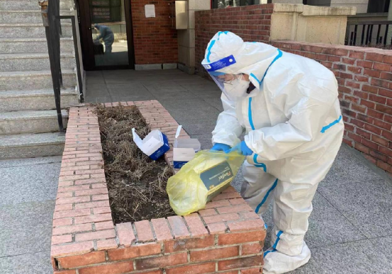 王欢主要负责为社区居民分发蔬菜包、发放试剂盒以及维护检测点秩序。这是她第一次穿医用防护服,防护服密不透气,年近50岁的她工作了几小时后,全身变得湿漉漉的,呼吸也感到不畅,即便如此,她依旧坚持在工作岗位上和年轻人一样为居民服务。