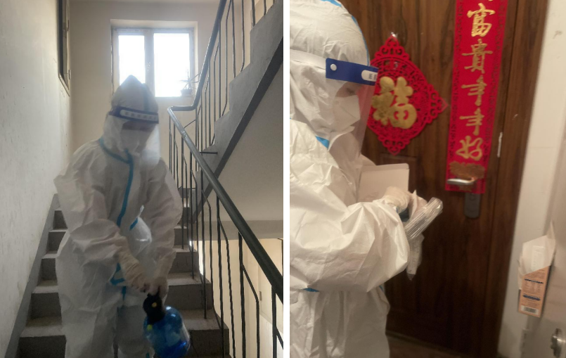 30多天的时间里,孙文雯每天往返于物资点、垃圾点、邻居家,进行楼道消杀、发放抗原自测试剂、配送生活物资、清理楼道垃圾,防护服里面衣服湿了干、干了又湿,已习以为常。