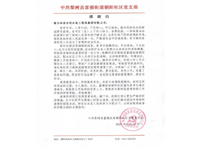 一封感谢信 浓浓战“疫”情中共梨树县富强街道朝阳社区支部委员会给水工局公司发来感谢信
