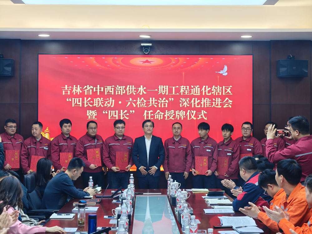 在党建调研和机制宣贯结束后,调研组一行还参加了通化分公司举行的“四长”任命授牌仪式,仪式上水网集团总经理仇旭、副总经理丛唯一,省设计院副院长习红凯分别向施工工区长、监理洞长、法人标段长、设计标段长授牌并颁发了任命书,标志着“四长联动”责任体系全面落地实施。