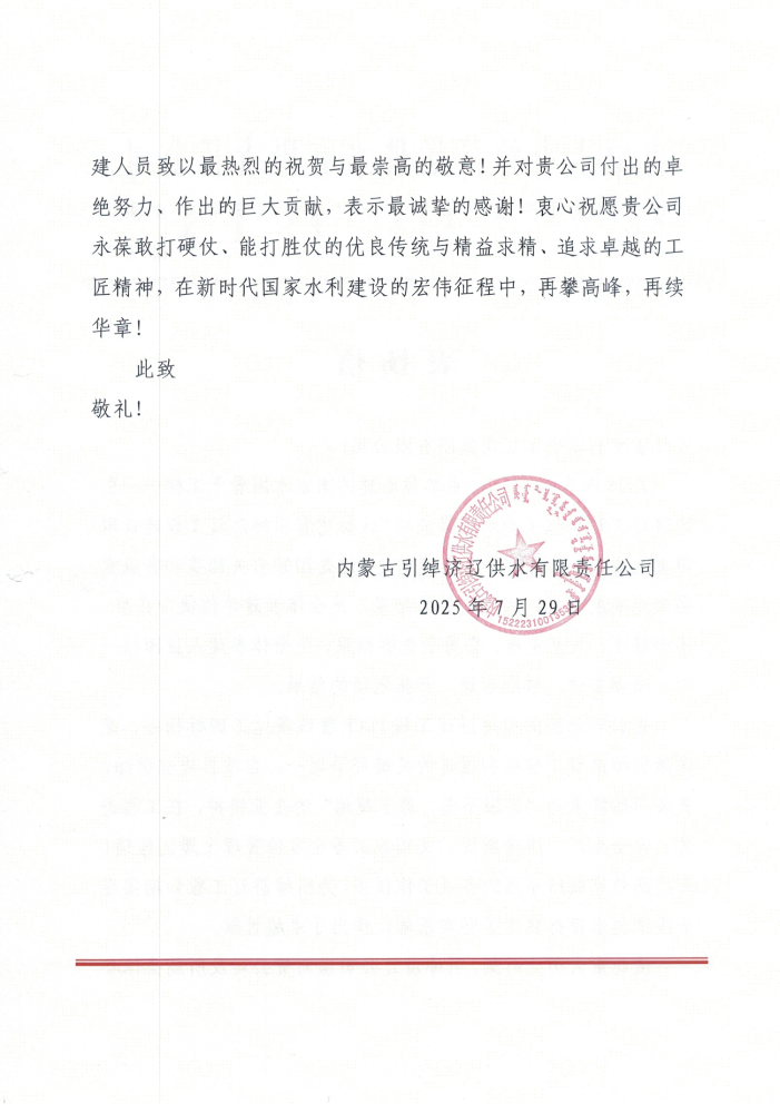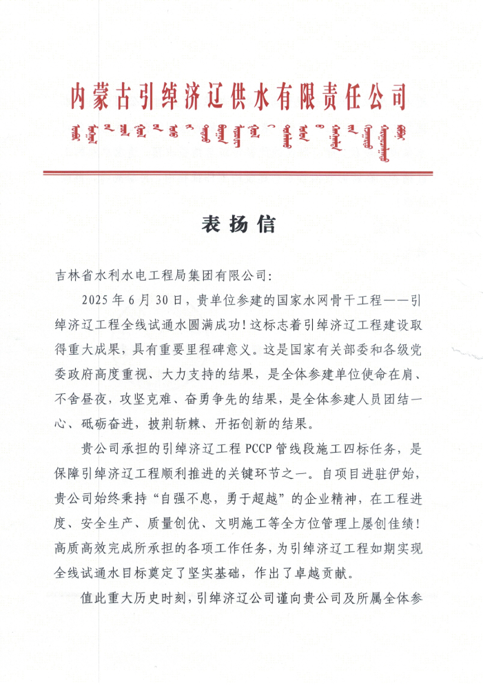 近日,水工局公司收到来自内蒙古引绰济辽供水有限责任公司的表扬信,信中对水工局公司在引绰济辽工程建设中的卓越表现给予高度肯定。