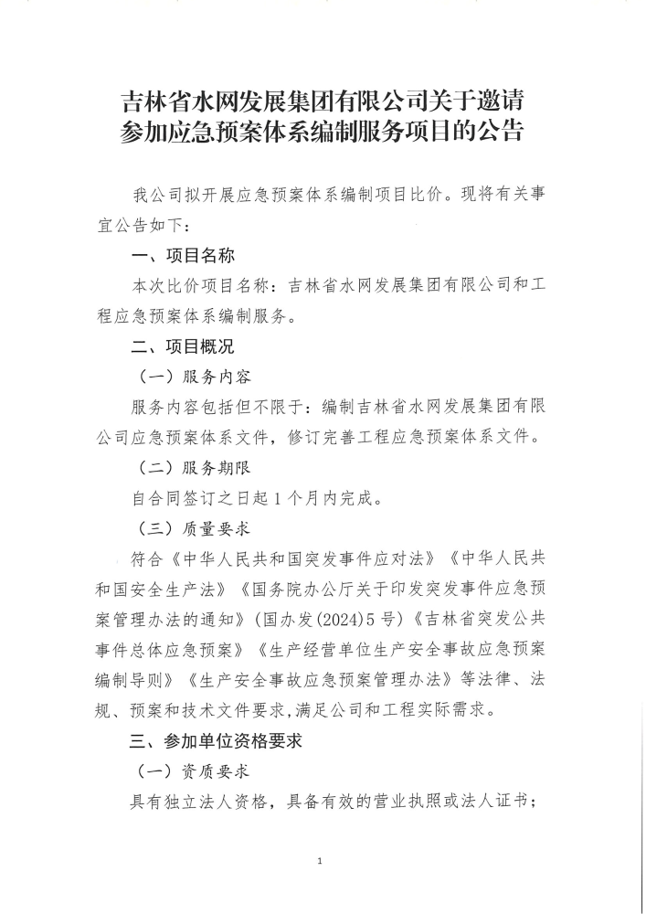 吉林省水网发展集团有限公司关于邀请参加应急预案体系编制服务项目的公告