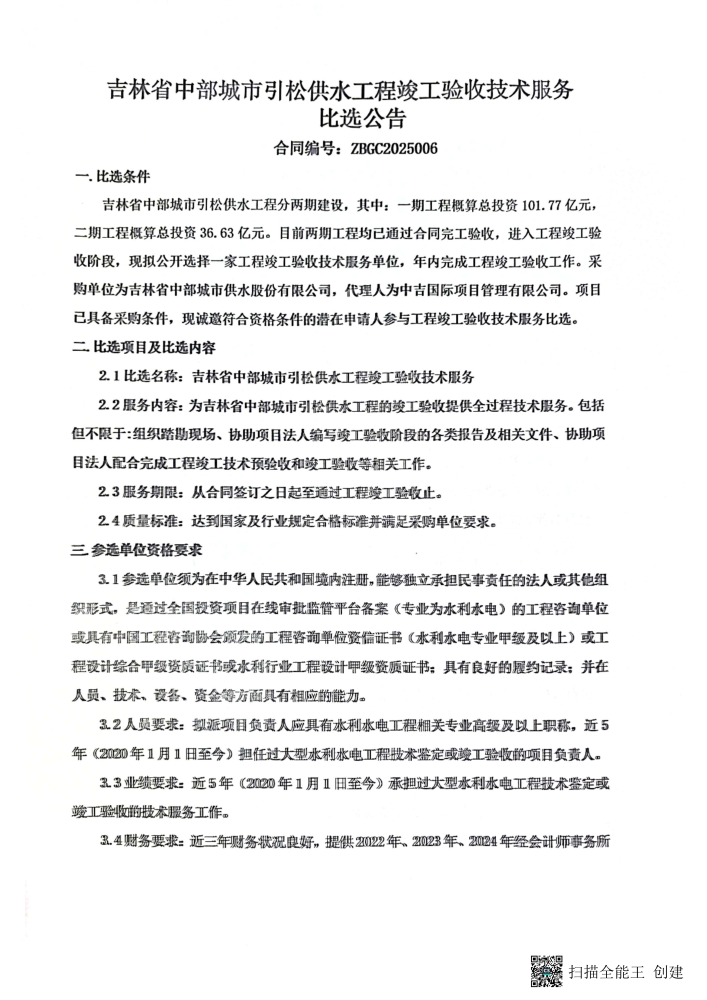 吉林省中部城市引松供水工程竣工验收技术服务比选公告