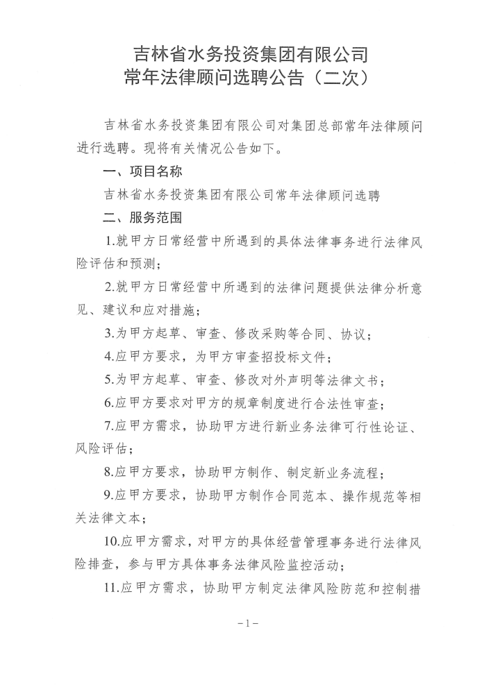 吉林省水务投资集团有限公司常年法律顾问选聘公告(二次)