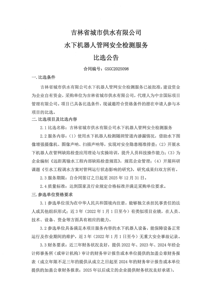 吉林省城市供水有限公司水下机器人管网安全检测服务比选公告