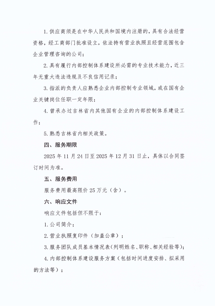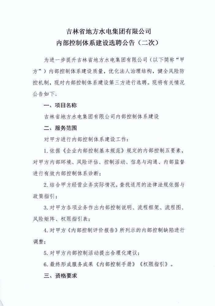 吉林省地方水电集团有限公司内部控制体系建设选聘公告(二次)