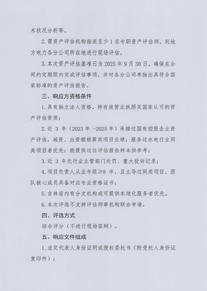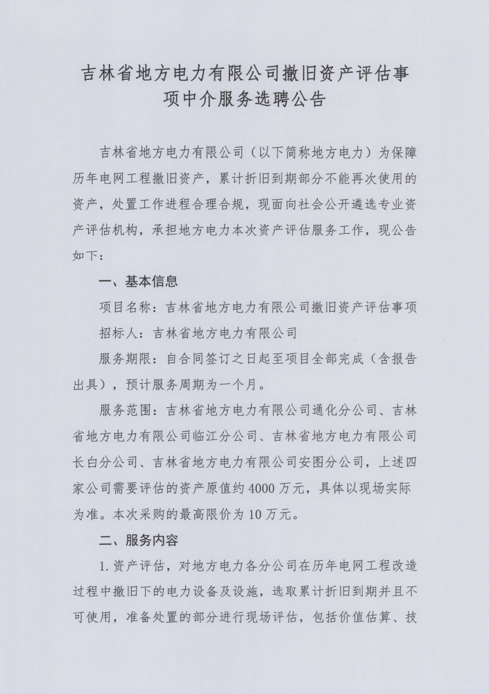 吉林省地方电力有限公司撤旧资产评估事项中介服务选聘公告