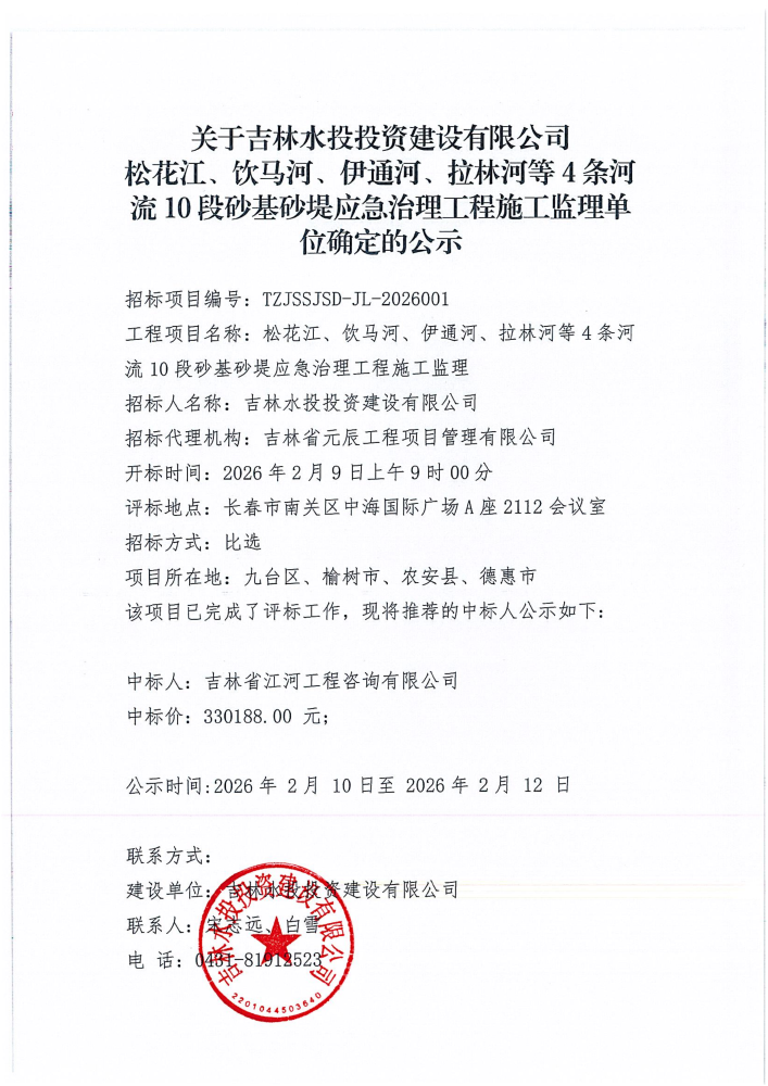 关于吉林水投投资建设有限公司松花江、饮马河、伊通河、拉林河等4条河流10段砂基砂堤应急治理工程施工监理单位确定的公示