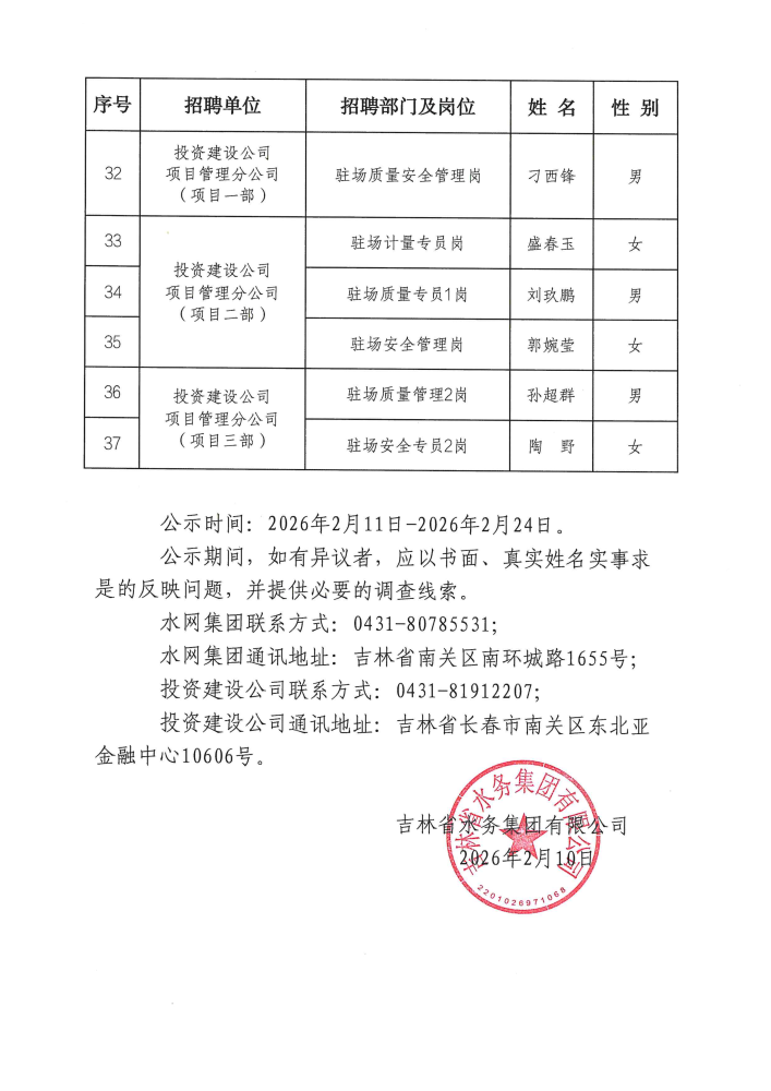 吉林省水务集团有限公司内部招聘拟聘用人员公示