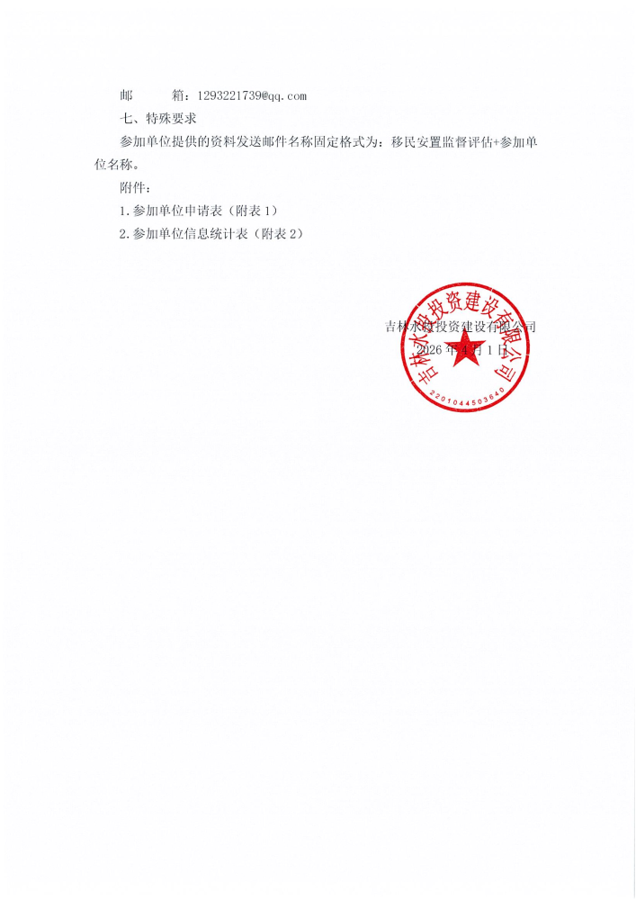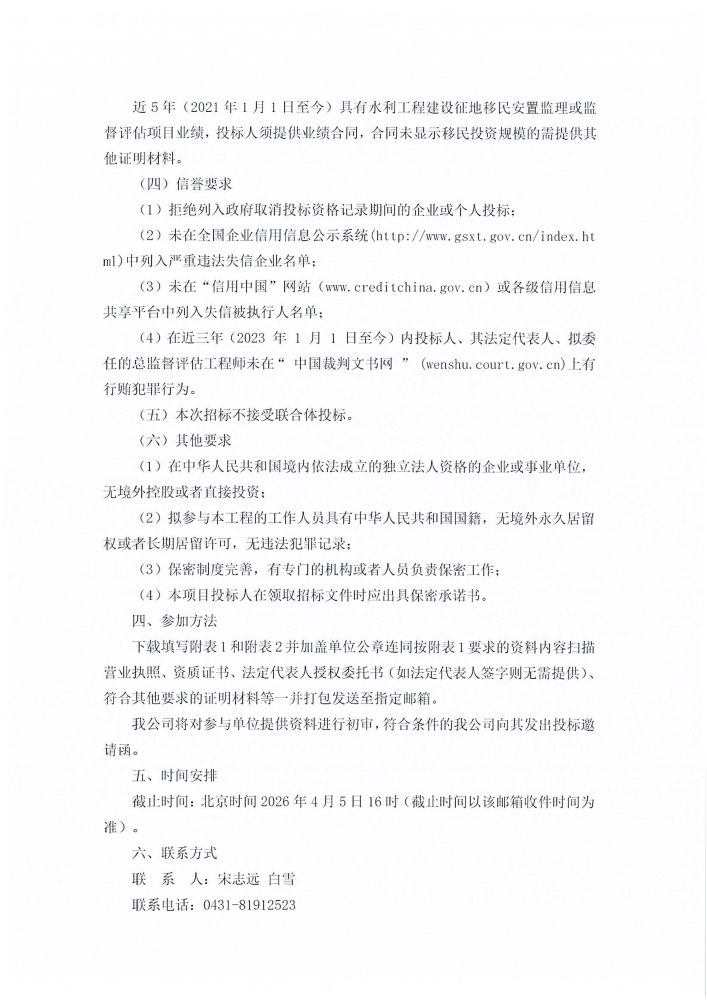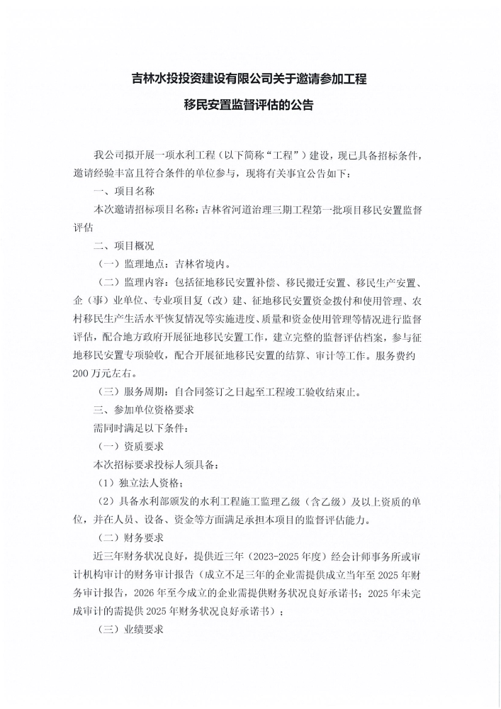 吉林水投投资建设有限公司关于邀请参加工程移民安置监督评估的公告