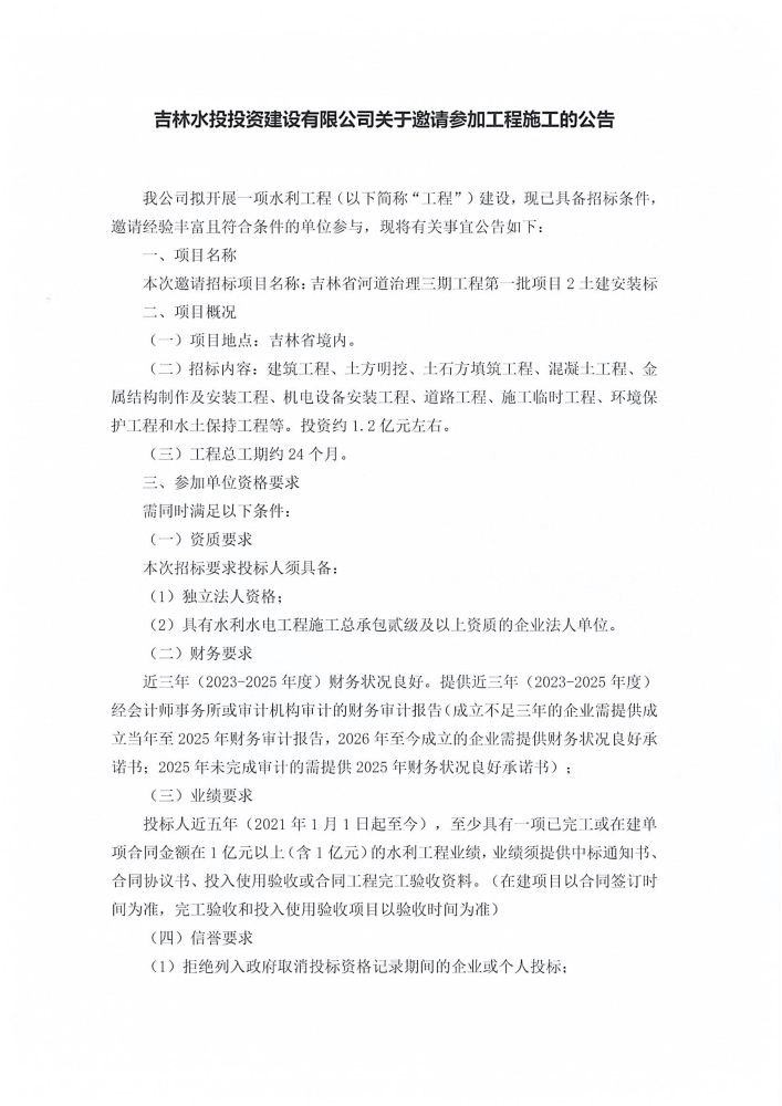 吉林水投投资建设有限公司关于邀请参加工程施工的公告(项目2)