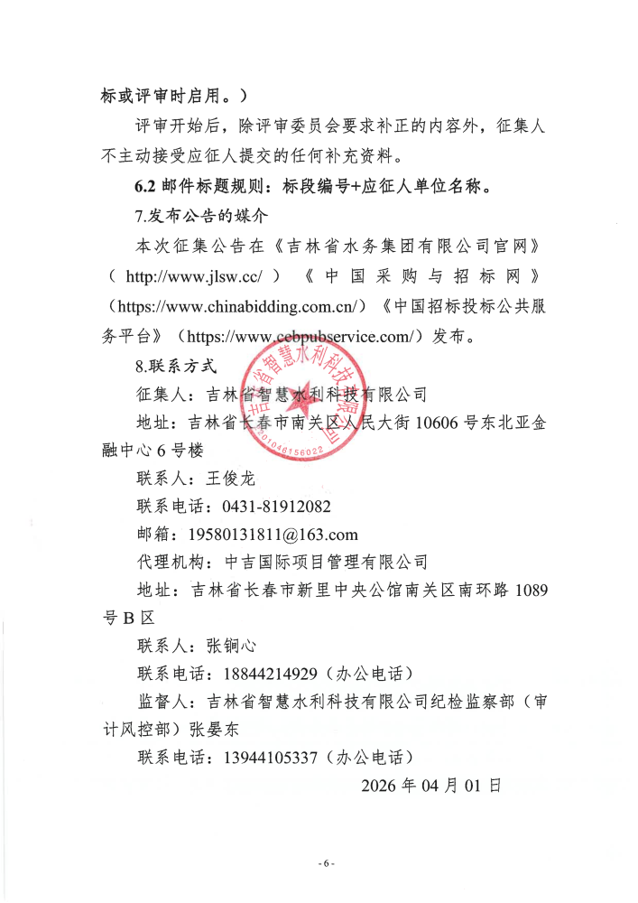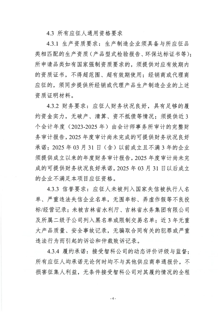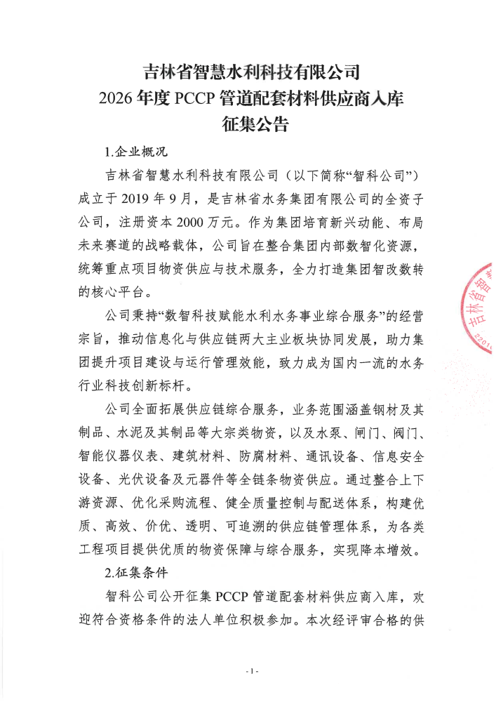 吉林省智慧水利科技有限公司2026年度PCCP管道配套材料供应商入库征集公告