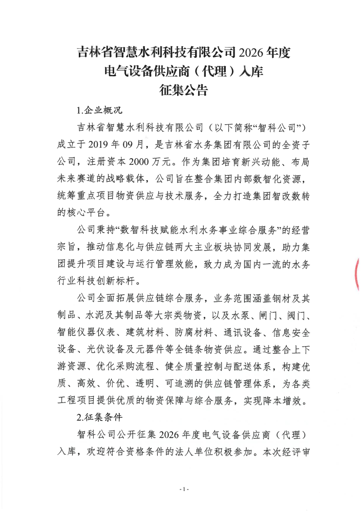 吉林省智慧水利科技有限公司2026年度电气设备供应商(代理)入库征集公告