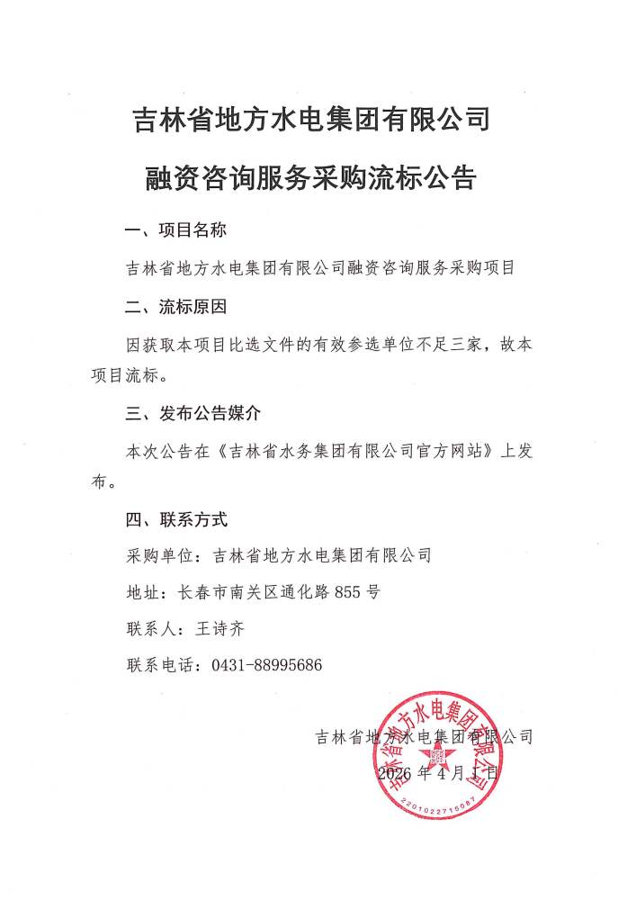 吉林省地方水电集团有限公司融资咨询服务采购流标公告