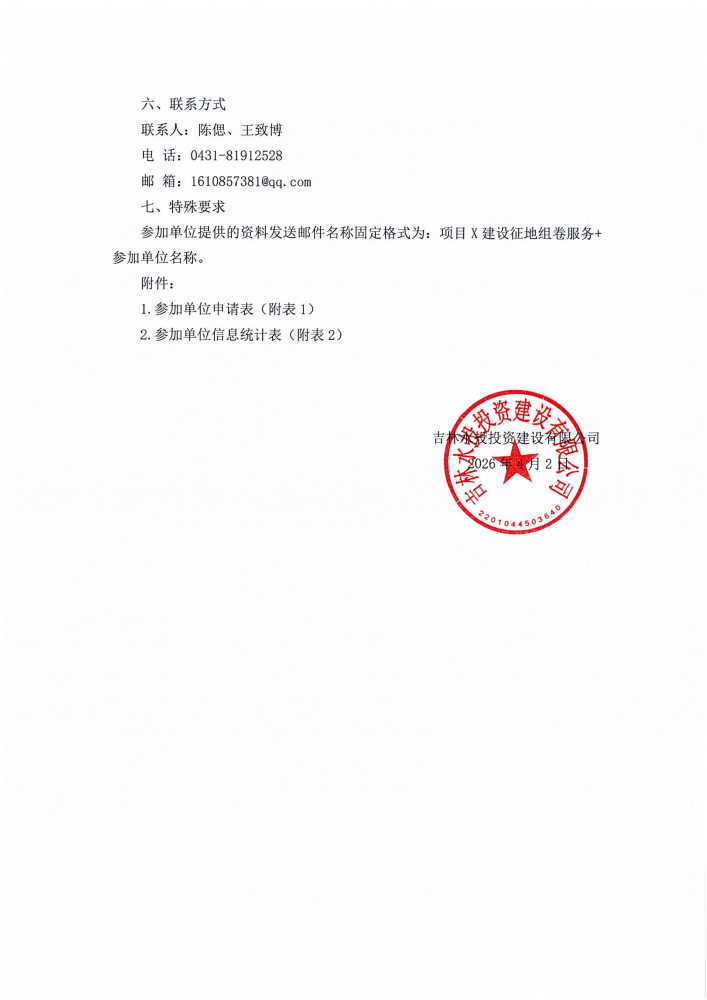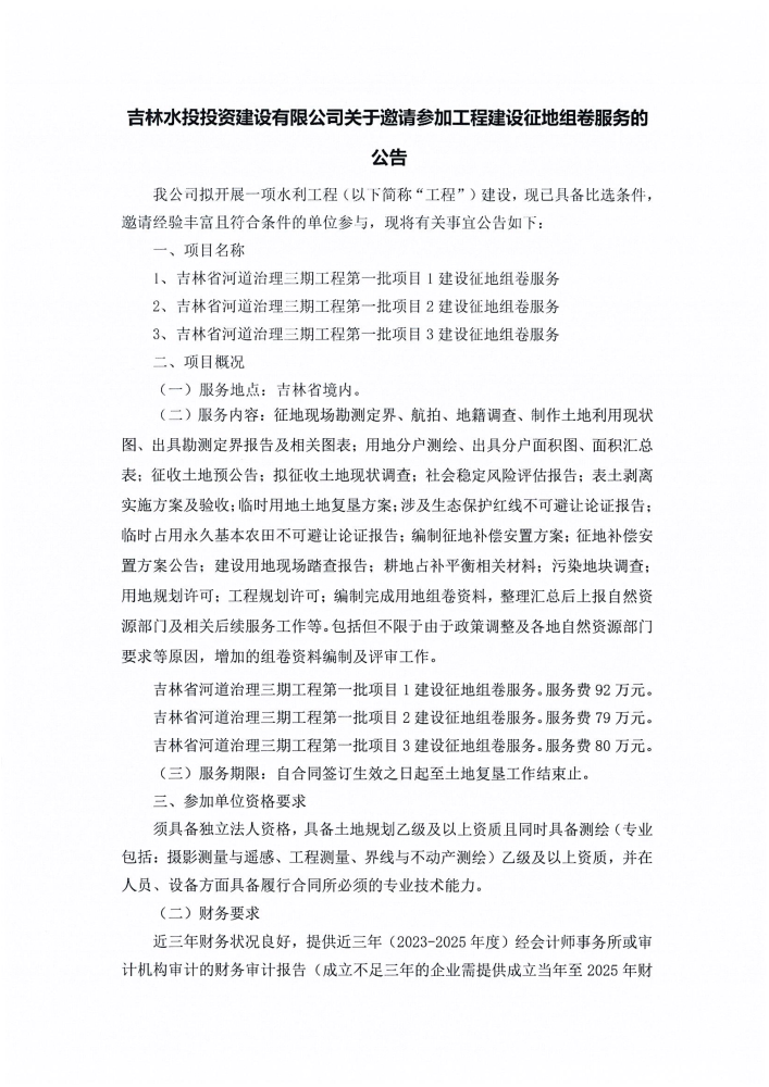 吉林水投投资建设有限公司关于邀请参加工程建设征地组卷服务的公告