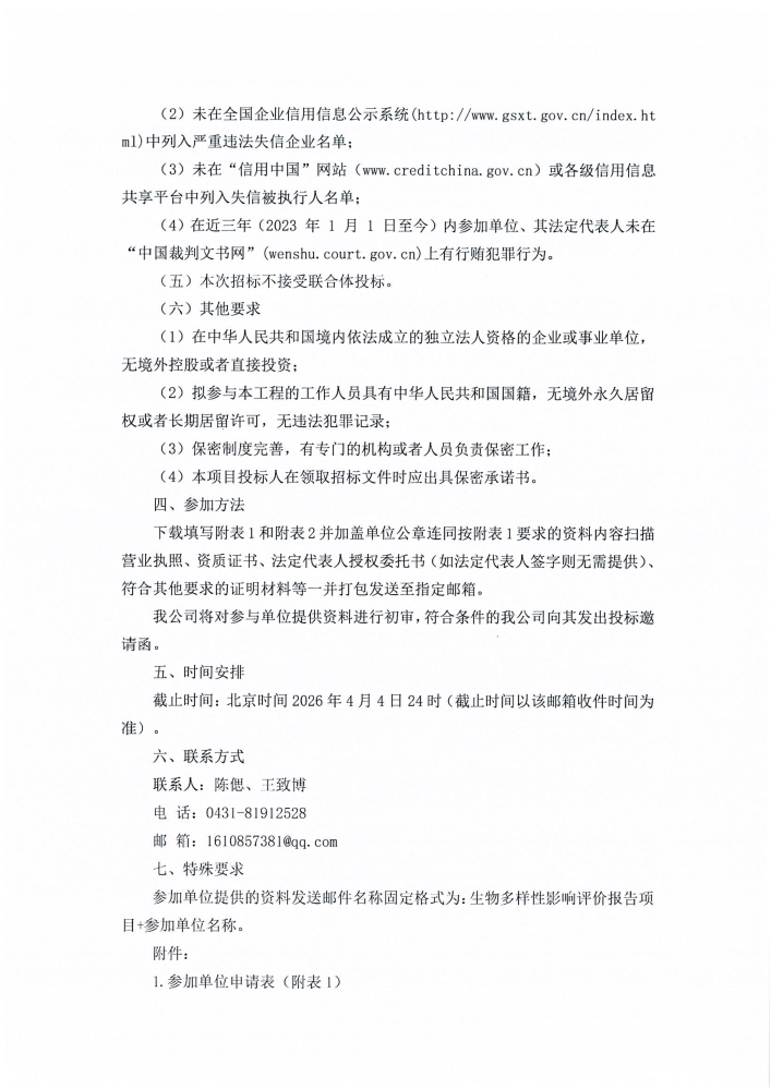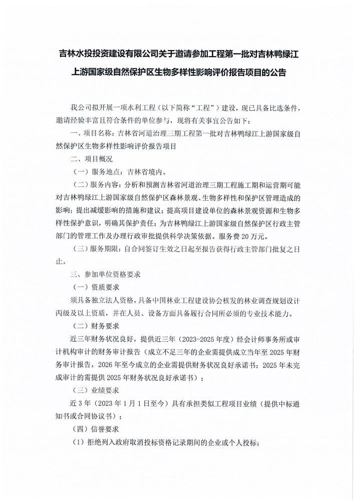 吉林水投投资建设有限公司关于邀请参加工程第一批对吉林鸭绿江上游国家级自然保护区生物多样性影响评价报告项目的公告