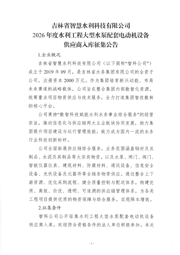 附件:1.吉林省智慧水利科技有限公司水利工程大型水泵配套电动机设备供应商(代理)入库公开征集公告.docx
