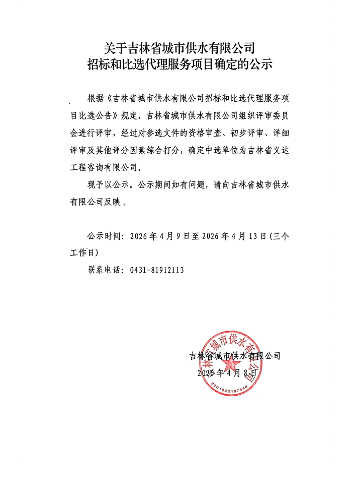 吉林省城市供水有限公司招标和比选代理服务项目中选公示