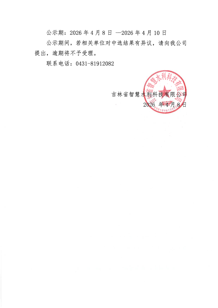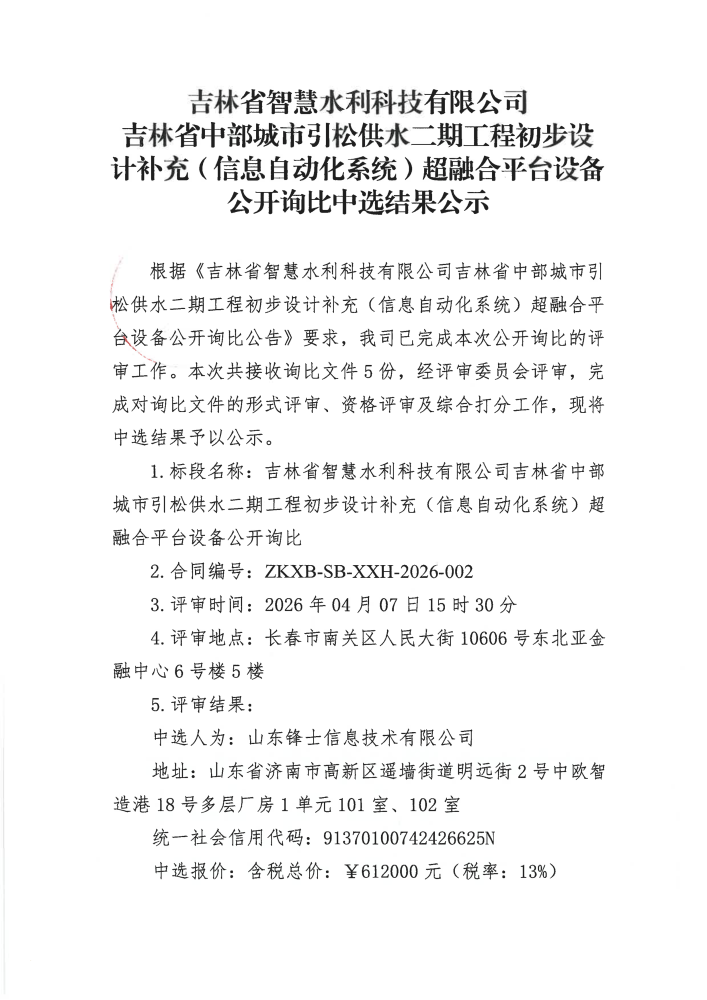 吉林省智慧水利科技有限公司吉林省中部城市引松供水二期工程初步设计补充(信息自动化系统)超融合平台设备公开询比中选结果公示