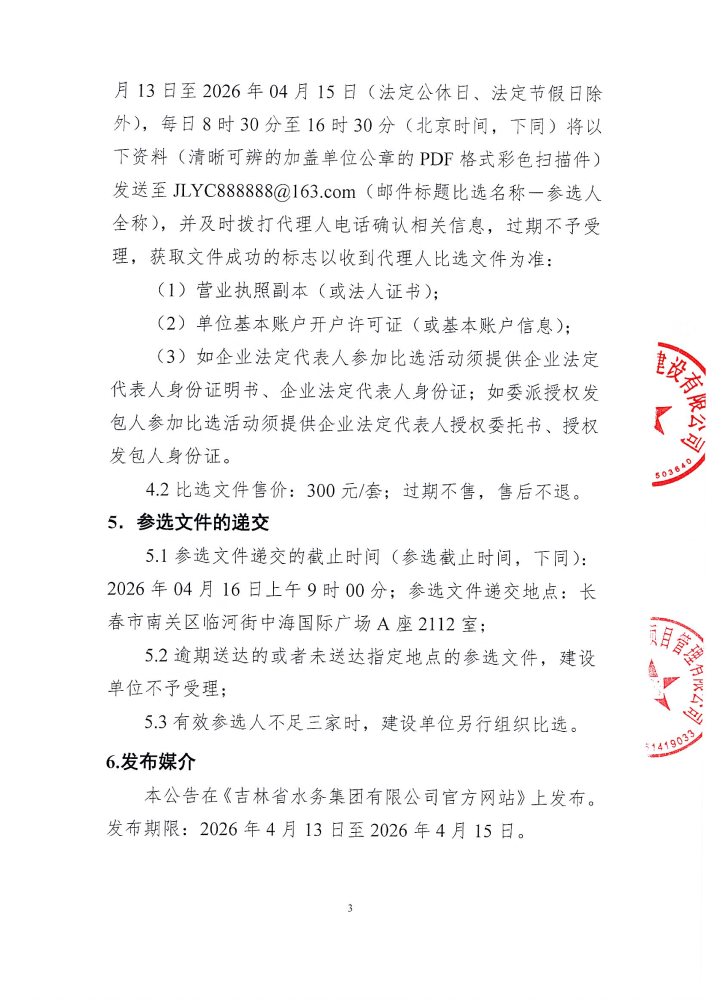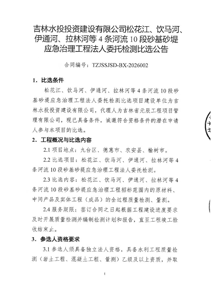 吉林水投投资建设有限公司松花江、饮马河、伊通河、拉林河等4条河流10段砂基砂堤应急治理工程法人委托检测比选公告