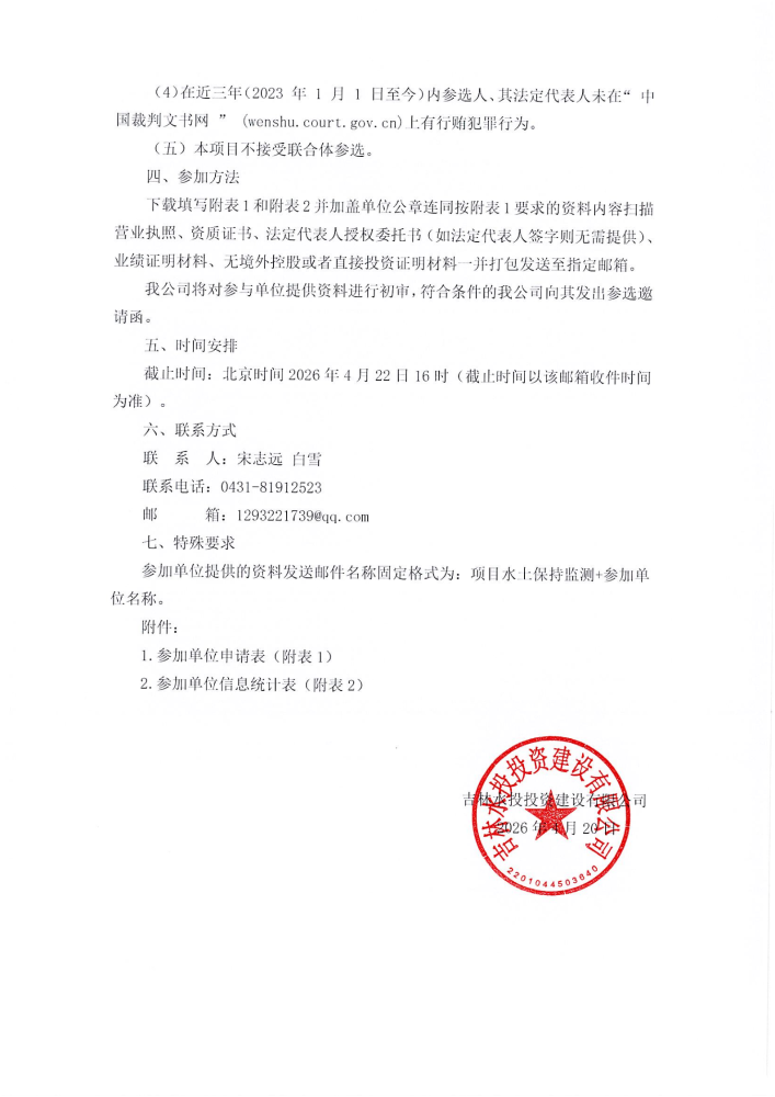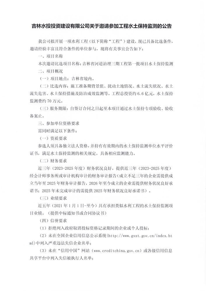 吉林水投投资建设有限公司关于邀请参加工程水土保持监测的公告