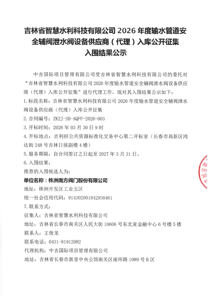 吉林省智慧水利科技有限公司2026年度输水管道安全辅阀泄水阀设备供应商(代理)入库公开征集入围结果公示