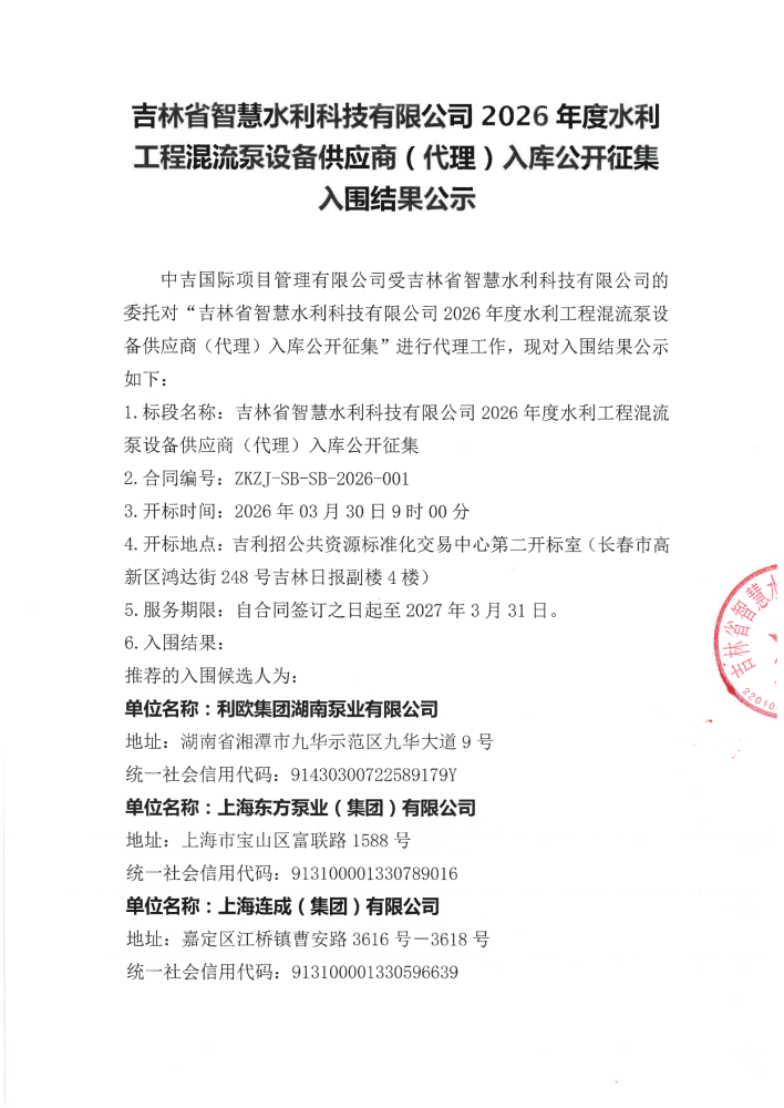 吉林省智慧水利科技有限公司2026年度水利工程混流泵设备供应商(代理)入库公开征集入围结果公示