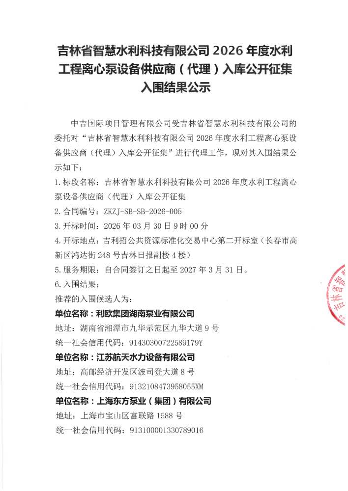 吉林省智慧水利科技有限公司2026年度水利工程离心泵设备供应商(代理)入库公开征集入围结果公示