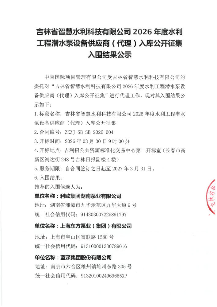 吉林省智慧水利科技有限公司2026年度水利工程潜水泵设备供应商(代理)入库公开征集入围结果公示