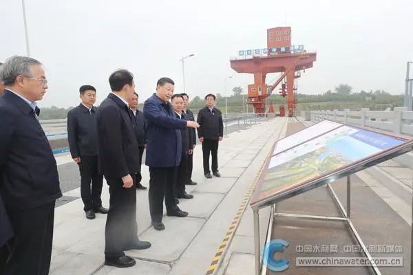 5月14日上午,中共中央总书记、国家主席、中央军委主席习近平在河南省南阳市主持召开推进南水北调后续工程高质量发展座谈会并发表重要讲话。这是座谈会前,习近平于13日在南阳市淅川县陶岔渠首枢纽工程察看引水闸运行情况。 (新华社记者 王晔 摄)5月13日,正值初夏,“国之重器”南水北调工程迎来了一位重要的客人。习近平总书记在陶岔渠首看工程运行情况,乘船考察丹江口水库。端起一杯新打上来的水库水,他笑着说:“‘水龙头’水质不错!”