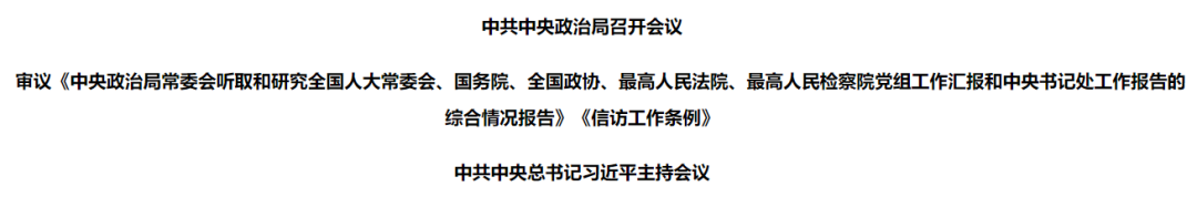中共中央政治局1月24日召开会议,审议《中央政治局常委会听取和研究全国人大常委会、国务院、全国政协、最高人民法院、最高人民检察院党组工作汇报和中央书记处工作报告的综合情况报告》、《信访工作条例》。中共中央总书记习近平主持会议。