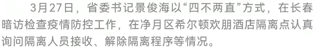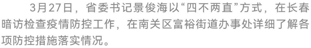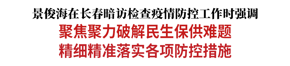 3月27日下午,省委书记景俊海再次以“四不两直”方式,在长春暗访检查疫情防控工作,对暗访中发现的问题,他直接告知长春市主要领导同志,要求立即整改到位。他强调,要深入贯彻习近平总书记关于疫情防控的重要指示精神,按照孙春兰副总理部署要求,坚定信心、攻坚克难,聚焦聚力破解民生保供难题,精细精准落实各项防控措施,坚决遏制住疫情蔓延势头。