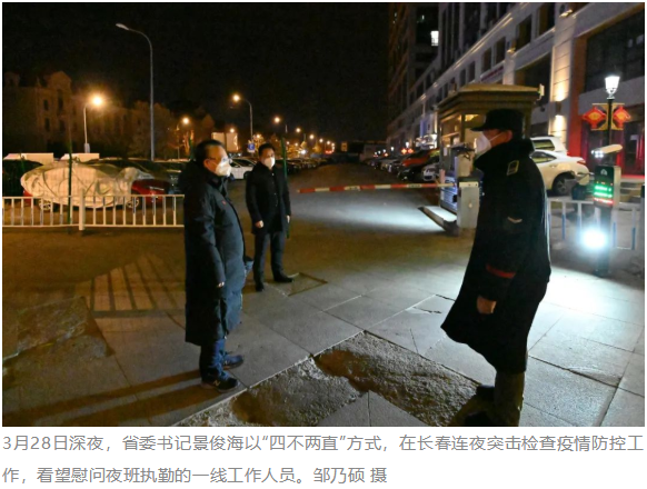 3月28日深夜,省委书记景俊海以“四不两直”方式,在长春连夜突击检查疫情防控工作,看望慰问夜班执勤的一线工作人员。景俊海向长春市主要领导同志反馈检查中发现的问题,要求采取有效措施,立即整改到位。他强调,要深入贯彻习近平总书记关于疫情防控的重要指示精神,按照孙春兰副总理部署要求,坚持快、准、严、实、细,态度更坚决、行动更迅速,采取更加适应奥密克戎变异毒株传播特点的防控措施,咬紧牙关、连续作战,尽快扭转疫情态势,全力打好打赢疫情防控阻击战歼灭战。