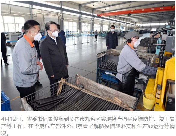 九台区企业正在分批次启动复工复产。景俊海到华奥汽车部件公司、中财管道公司,实地察看防疫措施落实和生产线运转等情况,要求企业严格实行员工集中居住、点对点闭环管理,科学安排人员班次,确保各工位之间保持安全距离。要组织员工开展高频次检测,发现风险必须第一时间报告,确保得到及时有效处置。要稳步有序恢复生产,加强与上下游企业沟通协同,保持产业链供应链稳定运行。