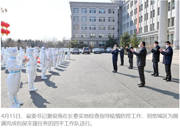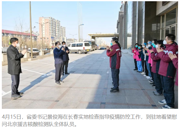 4月15日,省委书记景俊海在长春实地检查指导疫情防控工作,看望慰问一线工作人员。他强调,要深入贯彻习近平总书记关于统筹疫情防控和经济社会发展的重要讲话重要指示精神,按照孙春兰副总理部署要求,坚持科学精准、动态清零,压紧压实主体责任,彻底消除防控盲区,坚决守住不发生疫情规模性反弹底线。