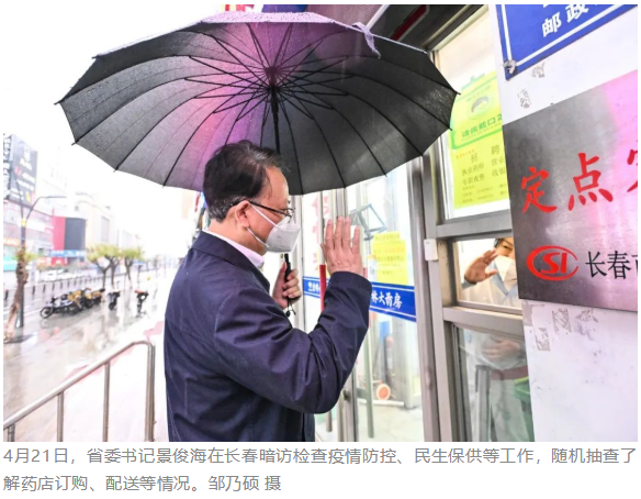 景俊海随机抽查新天地超市西朝阳路二店、吉林大药房同志街连锁店,实地了解线上订购、线下配送等情况,叮嘱工作人员严格遵守防疫规定,每日进行核酸检测,及时把药品物资送到小区,切实满足群众基本生活和正常用药需求。