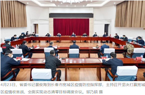 4月23日,省委书记景俊海到长春市宽城区疫情防控指挥部,主持召开坚决打赢宽城区疫情收官战、全面实现动态清零目标调度会议。他强调,宽城区广大党员干部要进一步把思想和行动统一到习近平总书记关于统筹疫情防控和经济社会发展的重要讲话重要指示精神上来,坚定不移贯彻“动态清零”总方针,坚持快、准、严、细、实,一鼓作气实现疫情防控目标,坚决夺取抗击疫情全面胜利。
