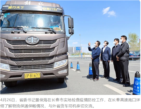 景俊海首先来到长春高速南口,实地检查物流保通保畅情况。景俊海与外省货车司机亲切交流,叮嘱他们自觉遵守防疫规定,规范做好个人防护,切实保护好自身安全。他要求省直有关部门扎实抓好保通保畅工作,撤销省内所有不符合规定的卡点,加快跨省通行证发放,确保物资运输通道畅通。要在高速公路收费站出口外广场、国省干线公路省界设置核酸检测服务站,对过往司机开展查验、提供抗原试剂和核酸采样等服务,实行“即采即走即追”闭环管理,做好货车司机基本生活服务保障和出入车辆全面彻底消杀,坚决守住外防输入关口。要关心关爱一线执勤民警和工作人员,进一步改善工作休息条件,让大家始终保持旺盛充沛的战斗力。