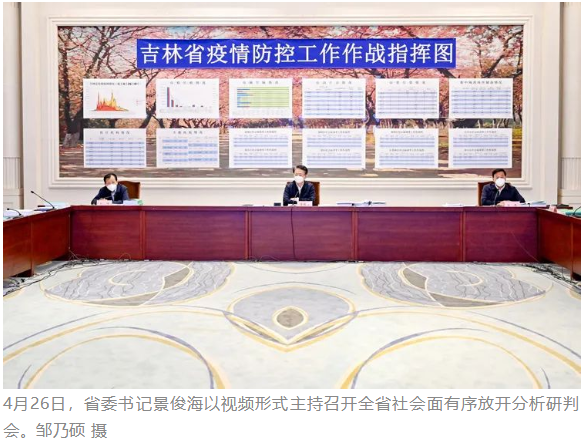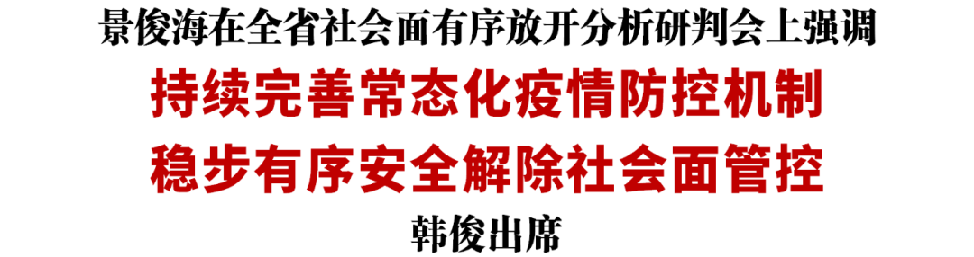 4月26日,省委书记景俊海以视频形式主持召开全省社会面有序放开分析研判会。景俊海强调,要深入贯彻习近平总书记关于统筹疫情防控和经济社会发展的重要讲话重要指示精神,按照孙春兰副总理部署要求,坚持科学精准、动态清零,持续完善常态化疫情防控机制,稳步有序安全解除社会面管控,循序渐进恢复正常生产生活秩序,奋力夺取疫情防控和经济社会发展双胜利。省委副书记、省长韩俊出席会议。