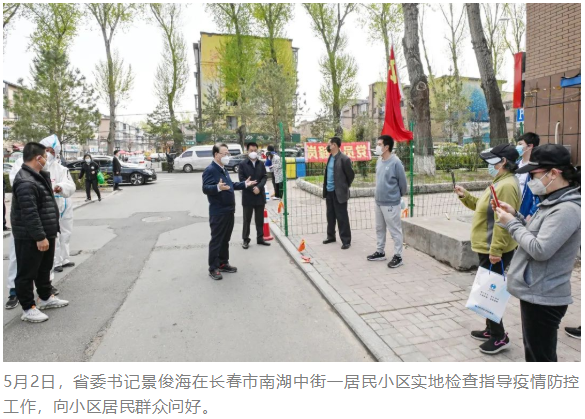 5月2日,省委书记景俊海在长春市随机查访居民小区、超市药店等处,实地检查指导疫情防控、市场保供等工作,看望慰问坚守一线的工作人员。景俊海强调,要深入贯彻习近平总书记关于高效统筹疫情防控和经济社会发展的重要讲话重要指示精神,按照孙春兰副总理部署要求,坚持“外防输入、内防反弹”总策略和“动态清零”总方针不动摇,慎终如始抓好常态化疫情防控,稳步有序恢复群众正常生产生活秩序,坚决做到防住疫情、稳住经济、安全发展。