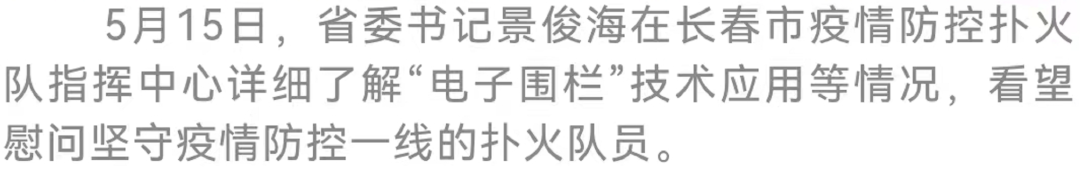 今天(5月15日),省委书记景俊海实地检查省及长春市疫情防控扑火队工作,看望慰问坚守疫情防控一线的扑火队员。他强调,要深入贯彻习近平总书记关于高效统筹疫情防控和经济社会发展的重要讲话重要指示精神,认真落实中共中央政治局常务委员会5月5日会议部署,始终坚持人民至上、生命至上,坚定不移贯彻“外防输入、内防反弹”总策略和“动态清零”总方针,以变应变、以快制快,发现一起、扑灭一起,努力以最小代价实现最大的防控效果,坚决巩固住来之不易的疫情防控成果,以实际行动迎接党的二十大胜利召开。