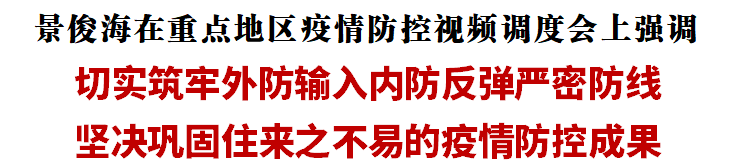 景俊海指出,目前全球疫情仍处于高位,我省外防输入压力不断增大。各级党委、政府必须深刻认识抗疫斗争的复杂性和艰巨性,深刻、完整、全面把握党中央确定的疫情防控方针政策,坚决克服认识不足、准备不足、工作不足等问题,坚决克服轻视、无所谓、自以为是等思想,坚决同一切歪曲、怀疑、否定我国防疫方针政策的言行作斗争,继续坚持快准严细实,进一步落实落细各项防控措施,切实加强口岸管理,严格执行落地检等要求,严防发生疫情规模性反弹。一要紧紧把牢平战转换关,长白县、图们市要立即实行提级管理,其他重点县(市、区)要密切关注疫情态势,一旦发现新的疫情,迅速采取坚决果断措施,有效遏制住疫情扩散蔓延。二要紧紧把牢核酸检测关,白山市、延边州、长白山保护开发区要立即开展多轮全域全员核酸检测,省直有关部门要尽快调集移动核酸检测车等检测力量前往支援,尽快摸清链条、找到源头,努力用最小的代价实现最大的防控效果。三要紧紧把牢监测预警关,进一步压紧压实“四方”责任,严格落实“四早”和“四应四尽”要求,省直有关部门要调派有抗疫经验的疾控专家、医护人员支援指导,市县两级一把手要深入一线、靠前指挥,着力健全监测预警和疫情防控指挥体系,抓好市域统筹、资源调配,发现一起、报告一起、处置一起、扑灭一起。四要紧紧把牢物资保障关,省上统筹调配核酸检测设备、试管、试剂和中药,加强防控能力建设,扎实做好防疫物资、生活物资储备和调运,优先保障重点地区需要,为防疫抗疫做足充分准备。要加大督查检查力度,指导督促有关地区以“五化”闭环工作法抓好落实,确保各项防控措施落到实处、见到实效。