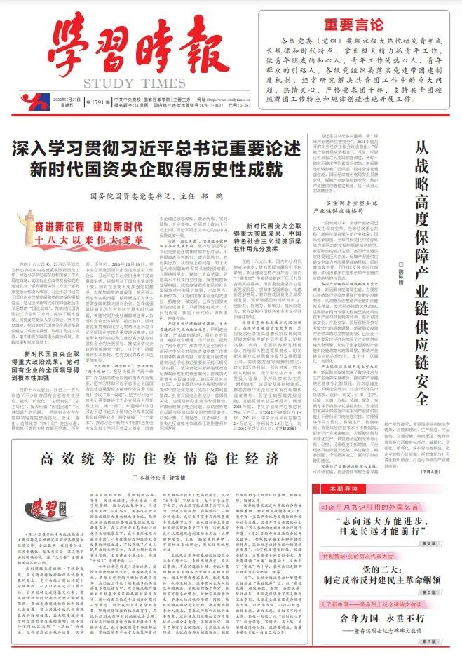 新时代国资央企实现的一切变革、作出的一切贡献、取得的一切成就,根本在于习近平同志党中央的核心、全党的核心掌舵领航,在于习近平新时代中国特色社会主义思想的科学指引。新征程上,国资央企将更加紧密地团结在以习近平同志为核心的党中央周围,以习近平新时代中国特色社会主义思想为指引,深刻领会“两个确立”的决定性意义,增强“四个意识”、坚定“四个自信”、做到“两个维护”,深入贯彻习近平总书记关于国有企业改革发展和党的建设的重要论述,贯彻落实党中央、国务院决策部署,坚定不移做强做优做大国有企业,加快打造世界一流企业,充分发挥国有经济主导作用和战略支撑作用,为全面建设社会主义现代化国家、实现中华民族伟大复兴的中国梦作出更大贡献,以实际行动迎接党的二十大胜利召开。(图片为编者所加)
