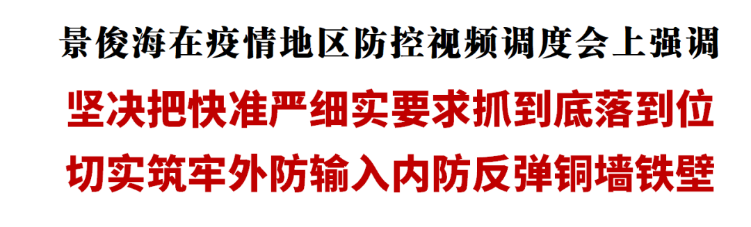 景俊海指出,各级党委、政府要深刻、完整、全面把握党中央确定的疫情防控方针政策,进一步压紧压实“四方”责任,严格落实“四早”和“四应四尽”要求,抓细抓实常态化防控和应急处置各项工作,切实做到控源准、阻断快、避险稳、预防严、检测细,坚决巩固住来之不易的疫情防控成果。一要在监测预警上持续用力,扎实推进常态化检测筛查,充分发挥发热门诊、药店等哨点作用,完善便捷灵敏的发现机制,构建多点触发的监测预警机制,确保疫情第一时间发现、第一时间预警、第一时间处置。二要在应急处突上持续用力,充实一线工作力量,进一步提升应急处置能力,加强疫情防控全时空、全流程、全链条闭环管理,切实做到隔离收治能力再增强、分类收治机制再健全、疫情处置再提速。三要在常态化防控上持续用力,针对奥密克戎变异毒株流行特点,因时因势科学调整防疫管控措施,规范医院和集中隔离点管理,严格落实重点场所和重点人员闭环管理措施,进一步加强农村地区疫情防控;切实做好常态化疫情防控条件下的中高考组织工作,确保安全平稳有序进行。四要在构筑群防群控防线上持续用力,教育引导广大群众增强责任意识、自我防护意识,自觉养成戴口罩、勤洗手、多通风、不聚集、保持安全距离等习惯,持续加强疫苗接种工作,切实筑牢多层次全方位防控体系。五要在高效统筹上持续用力,在防住疫情基础上,动态调整管控措施,该放的有序放开,该管的坚决管好,全力稳住经济增长,坚定不移保市场主体、保就业、保民生,努力实现“止跌、回升、增长”目标。