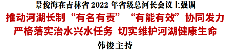 6月8日,吉林省2022年省级总河长会议以视频形式召开。省委书记景俊海出席会议并讲话。他强调,要深入贯彻习近平生态文明思想和习近平总书记致信祝贺2022年六五环境日国家主场活动重要指示精神,认真落实《求是》杂志发表的习近平总书记重要文章《努力建设人与自然和谐共生的现代化》精神,准确把握河湖长制改革发展新要求,推动河湖长制“有名有责”“有能有效”协同发力,严格落实治水兴水任务,切实维护河湖健康生命,以水为核心,系统推进生态文明建设,以实际行动迎接党的二十大胜利召开。省委副书记、省长韩俊主持会议。