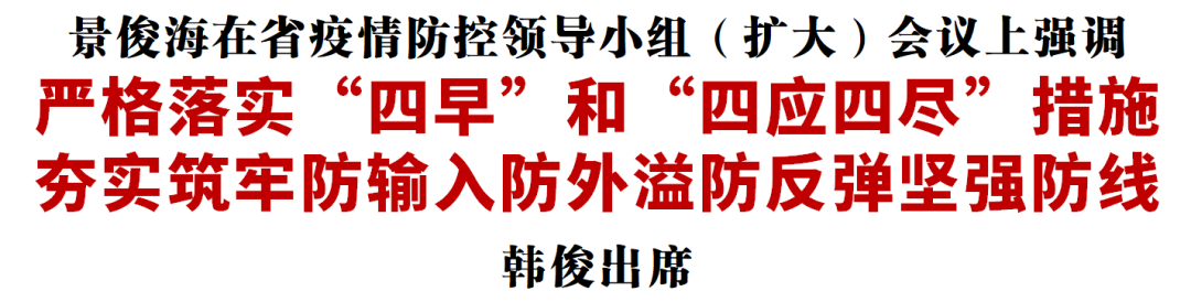 6月16日,省委书记景俊海以视频形式主持召开省疫情防控领导小组(扩大)会议。他强调,要深入贯彻习近平总书记关于高效统筹疫情防控和经济社会发展的重要讲话重要指示精神,始终坚持人民至上、生命至上,毫不动摇坚持“动态清零”总方针,以快制快、以变应变,进一步压紧压实“四方”责任,严格落实“四早”和“四应四尽”措施,夯实筑牢防输入、防外溢、防反弹坚强防线。省委副书记、省长韩俊出席会议。