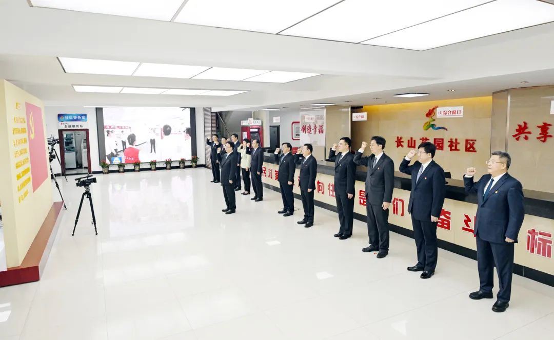 6月23日至24日,省委书记景俊海率领新一届省委常委班子在长春、四平等地进行集体学习调研,在长春市宽城区团山街道长山花园社区为民服务大厅集体宣誓,重温入党誓词。