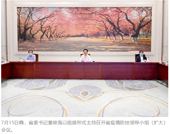 7月15日晚上,省委书记景俊海以视频形式主持召开省疫情防控领导小组(扩大)会议,专题调度榆树市疫情防控工作,全面部署全省疫情防控任务。他强调,要深入贯彻习近平总书记关于高效统筹疫情防控和经济社会发展的重要讲话重要指示精神,始终坚持人民至上、生命至上,毫不动摇坚持“外防输入、内防反弹”总策略和“动态清零”总方针,切实把快准严细实贯穿应急处置全过程,坚决守住来之不易的疫情防控成果。省委副书记、省长韩俊出席会议。