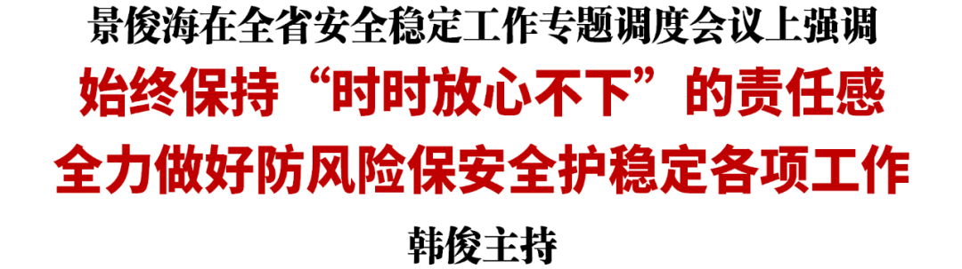 在听取省直有关部门汇报后,景俊海指出,做好安全稳定工作是当前重大政治任务。要坚定不移维护政治安全,严格落实意识形态工作责任制,坚决维护安定团结的政治局面。要坚定不移维护经济安全,在推动高质量发展中防范化解重大经济风险,有效保障粮食安全、能源安全、金融安全,全力稳住经济大盘。要坚定不移维护社会安全,扎实做好治安管理、信访化解等工作,确保社会大局稳定。要坚定不移维护生产安全,全面压紧压实责任,全覆盖开展风险排查整治,坚决遏制重特大事故发生。要坚定不移维护卫健安全,严格规范开展常态化核酸检测和重点人群日检测,加强全时空闭环管理,坚决守住不发生疫情规模性反弹底线。要坚定不移维护边境安全,确保边疆稳定、边防稳固、边民安定。要坚定不移维护生态安全,守护好吉林绿水青山黑土地、蓝天白云好空气。要坚定不移维护网络安全,全面落实网络意识形态工作责任制和网络安全工作责任制,坚决守住网络阵地。